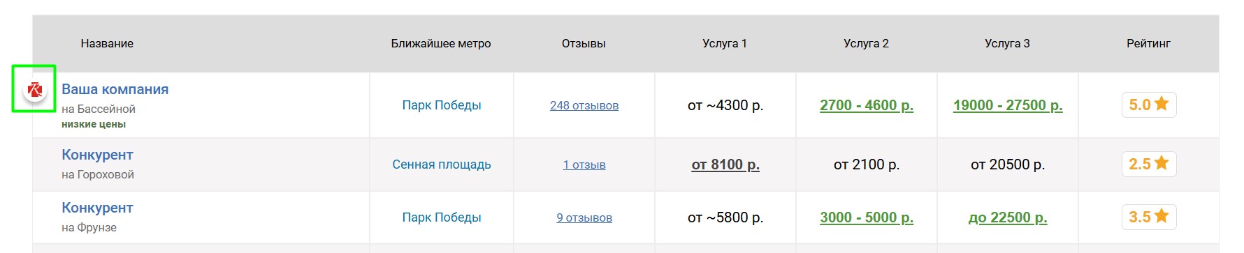 Иконка 16х16 пикселей будет отображаться слева от названия вашего автосервиса в таблицах, выделяя его среди прочих. Опция увеличивает вероятность перехода на страницу компании и рекомендуется в качестве дополнения к прочим методам продвижения, в первую очередь для автосервисов с узнаваемым брендом.